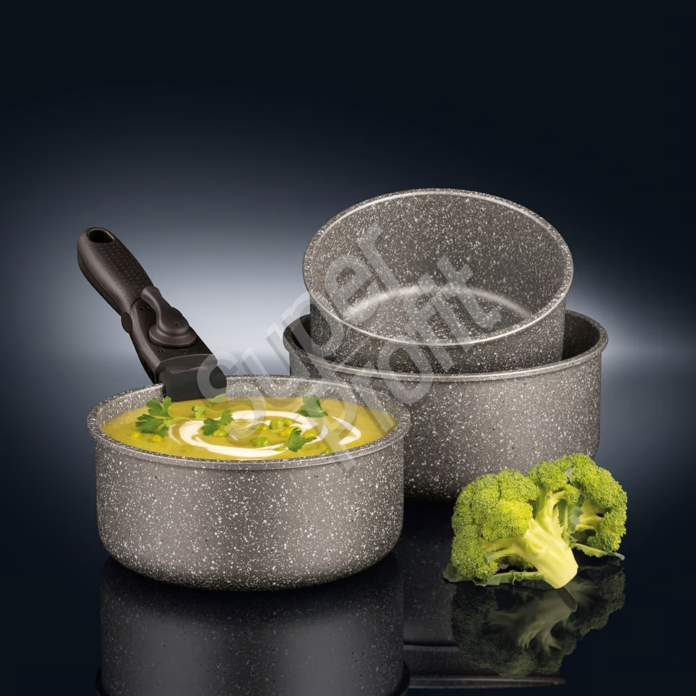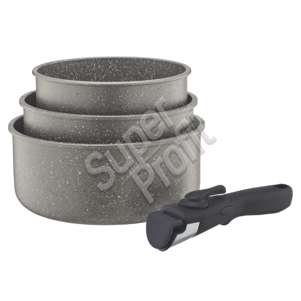 Idealne rozwiązanie dla wszystkich, którym brak miejsca w kuchennych szafkach i stawiają na inteligentne rozwiązania ułatwiające codzienne gotowanie. Garnki do indukcji wykonane są z aluminium, co czyni je niezawodnymi w użytkowaniu i trwałymi. Wewnątrz pokryte są wysokiej jakości powłoką nieprzywieralną Qualum Basic Stone Edition o bardzo dobrej odporności na ścieranie. Posiadają odpinaną rączkę, co gwarantuje maksymalną oszczędność miejsca podczas przechowywania. Dzięki zastosowaniu systemu odpinanej rączki i przechowując jedno naczynie w drugim, zajmują niewiele miejsca w kuchni. Konstrukcja rączki zapewnia pewne trzymanie w dłoni. Garnki dobrej jakości można używać do gotowania, smażenia, pieczenia w piekarniku (należy wtedy zdjąć rączkę), przechowywania w lodówce oraz serwowania na stół. Przystosowane są do używania na wszystkich typach kuchenek, w tym indukcyjnych oraz do piekarnika. Można je także myć w zmywarce (bez odpinanej rączki).