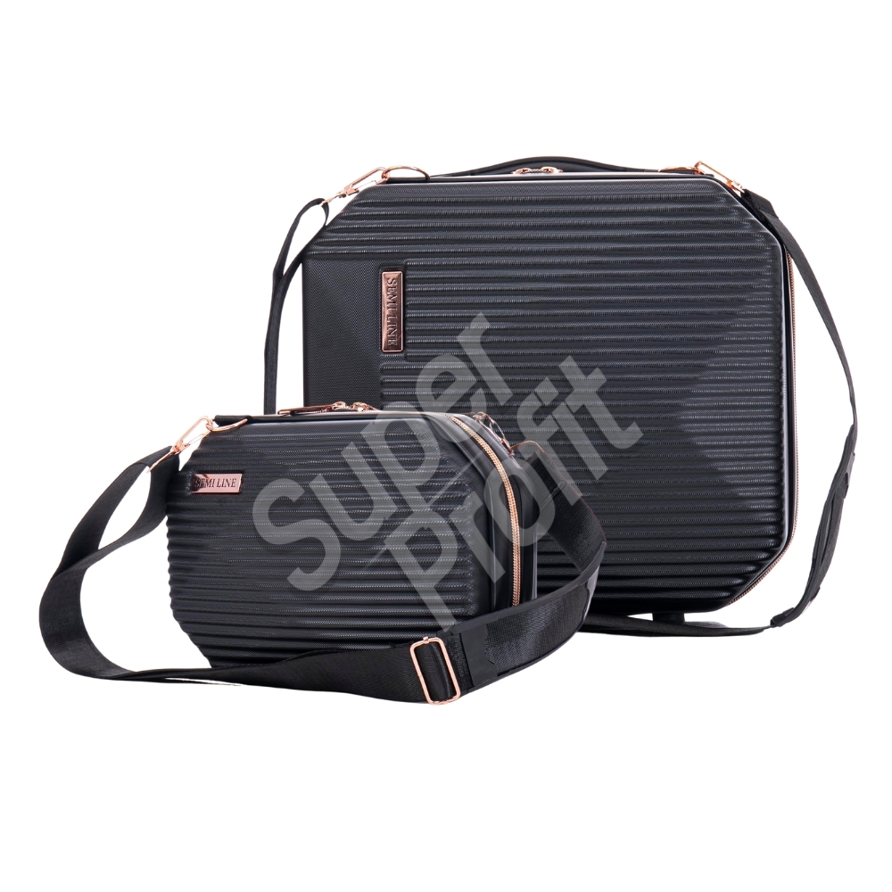 Zestaw wykonany z ABS-u, komora podzielona na dwie części. Kieszonka wewnętrzna z siatki zamykana na suwak. Z tyłu kosmetyczki pasek umożliwiający nałożenie jej na walizkę. Uchwyt oraz odpinany, regulowany pasek.